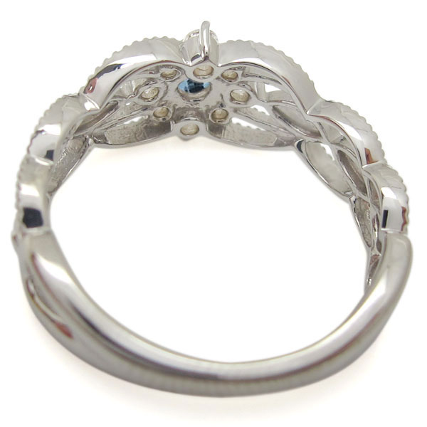 3月誕生石アクアマリンサンタマリアを使用した、プラチナ製のアンティーク調取り巻きデザインリング(指輪)です。