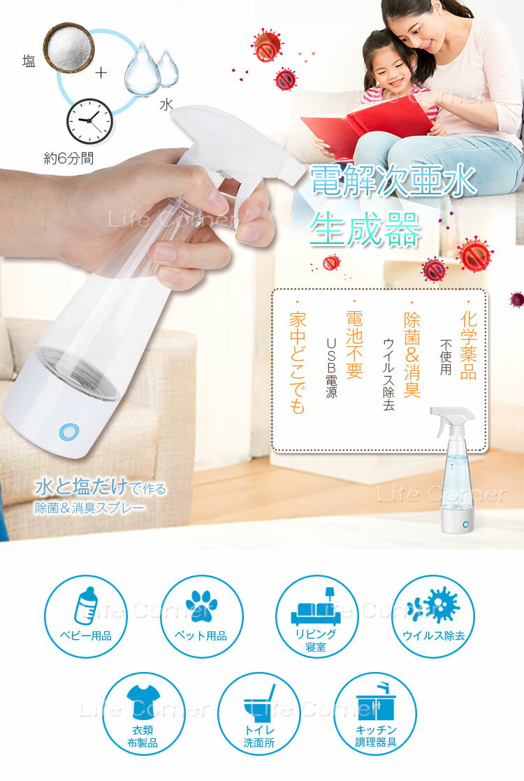 【二つモードの濃度生成可能】: 1.除菌&消臭モード :低濃度 食塩約10g(約1杯)+250ml水で6分間完成。