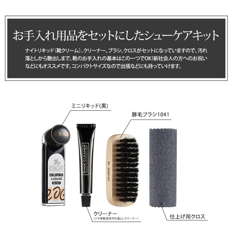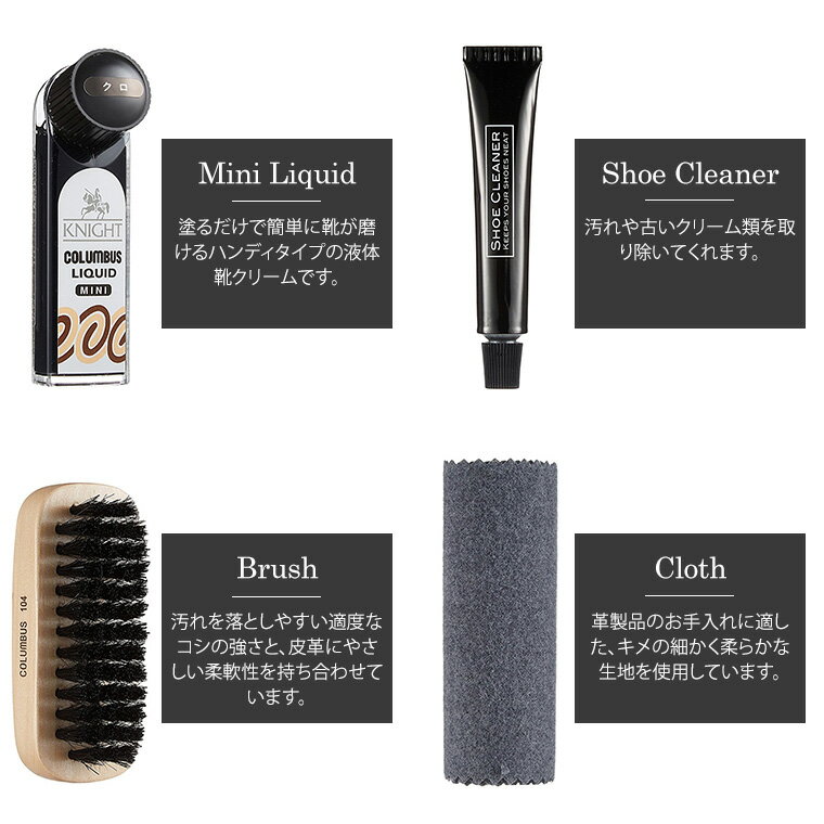 ■商品詳細 ●セット内容 ポリプロピレンケース クリーナー(ツヤ革靴専用汚れ落としクリーナー)×1 豚毛ブラシ104×1 ミニリキッド(黒)×1 仕上げ用クロス×1 ●ケースサイズ 縦40×横100×100mm ■使用上の注意 ●お子さまの手の届かないところに保管してください。